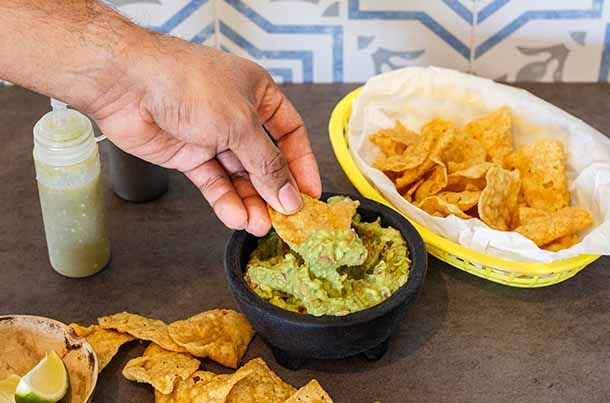 Fresh avocado, guacamole, rice, beans, refriend beans