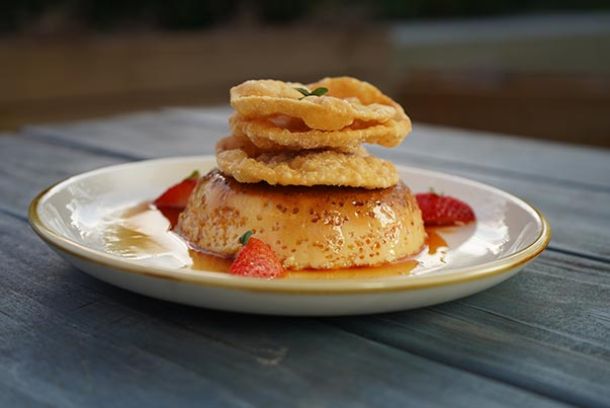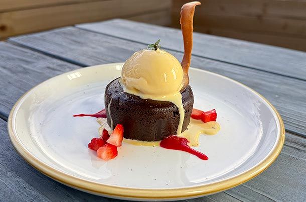 Chocolate cake with a molten center, served warm and topped with a scoop of vanilla ice cream..........9
