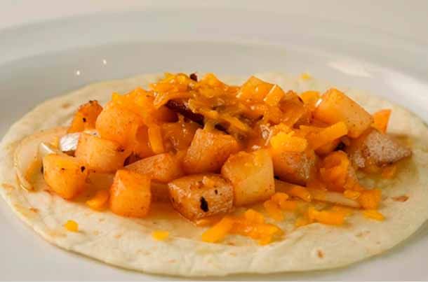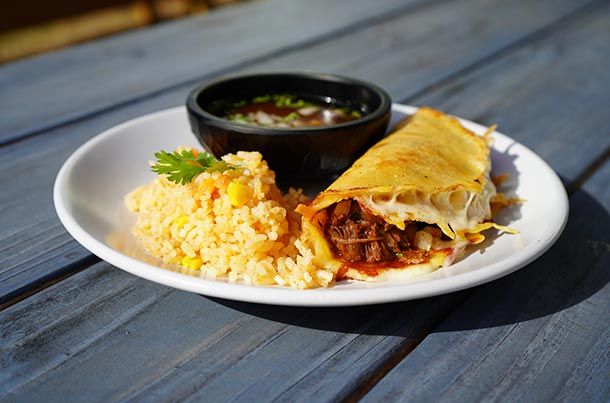 Your choice of filling wiht refried beans, lettuce, guacamole, rice, and melted cheese in a flour tortilla