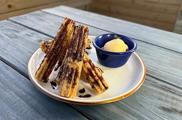 Fried dough pastries rolled in cinnamon and sugra,served with chocolate sauce and whipped cream for dipping..........9